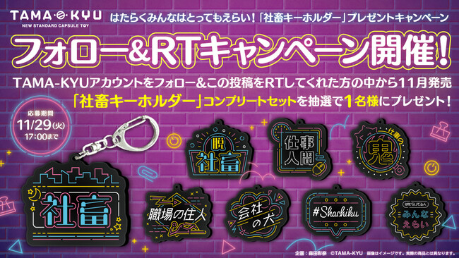 ただいまTAMA-KYU(たまきゅう)公式Twitterにて「\はたらくみんなはとってもえらい/社畜キーホルダー」全種セットが当たるキャンペーンを行う予定です!