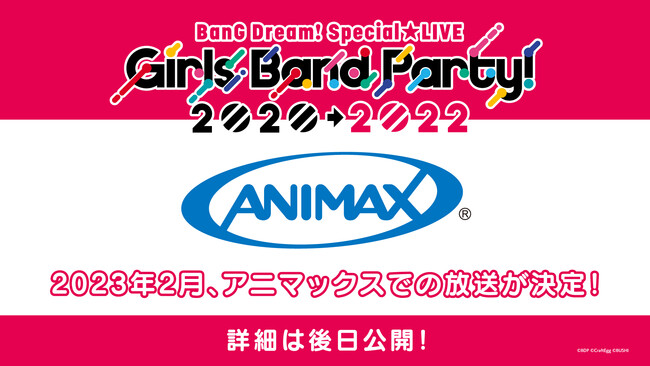 「アニマックス」にて、「BanG Dream! Special☆LIVE Girls Band Party! 2020→2022」の模様が、2023年2月に最速放送されることが決定しました。詳細は後日の発表をお待ちください。