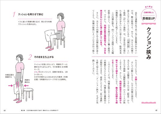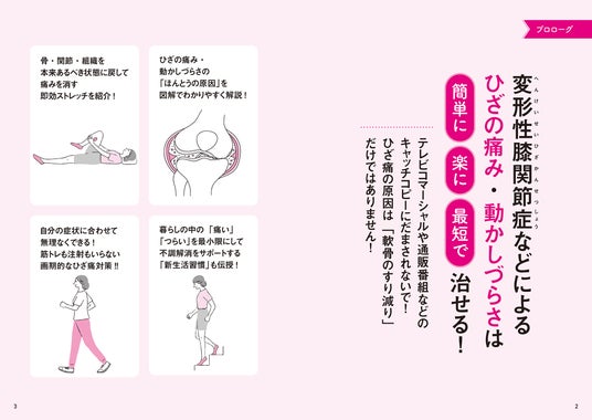 変形性膝関節症によるひざの痛みを消す「特効ストレッチ」や、ひざの違和感を解消する「著効セルフケア」など、普段の痛い、つらいといった症状を「簡単」「楽」「最短」で治すためのコツやノウハウが満載!
