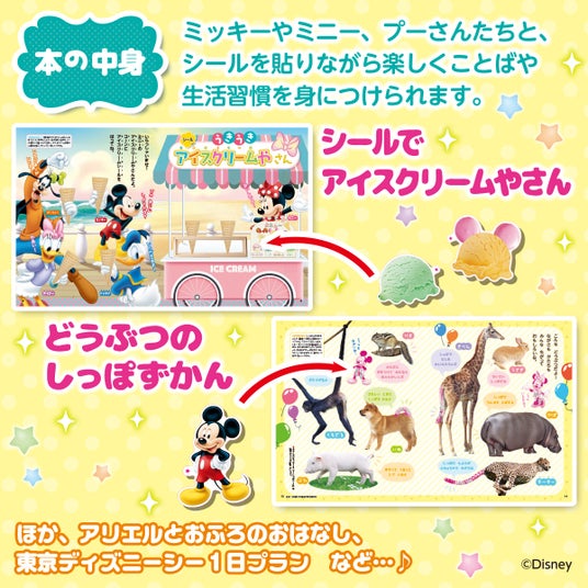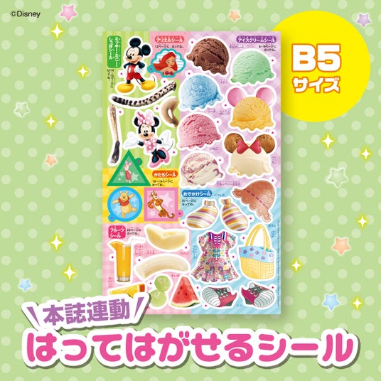 貼ったりはがしたりして繰り返し遊べます。本誌連動のキャラクターシールで、子どもの興味をページに一層ひきつけます。今号では、アイスクリームやさんごっこや、ミニーのおきがえなどを楽しめます。