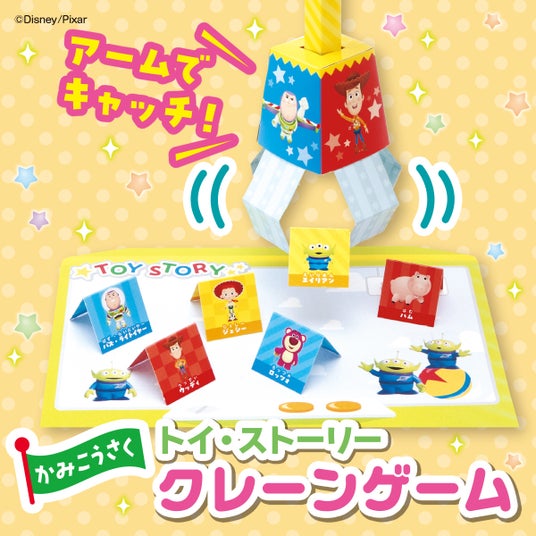 紙工作でつくったアームを動かして、キャラクターシートをつかみ、クレーンゲーム遊びができます。