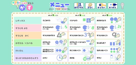 学習の領域は、「レディネス」「すうじをよむ」「すうじをかく」「かぞえる くらべる」「けいさん」「せいかつのなかのさんすう」で、子どもの発達段階に合わせて組み合わせ、学ぶことができます。■レディネス