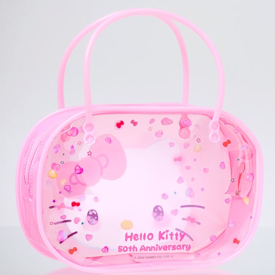 注目は、別冊ふろく! ハローキティ50周年の大人気デザインを施した、本誌限定のクリアバッグです。瞳からきらきらがあふれるハローキティのイラストが、とってもキュート(ハート)