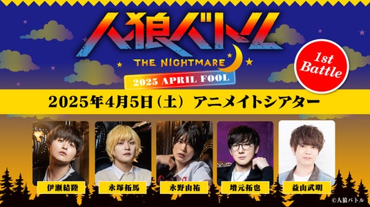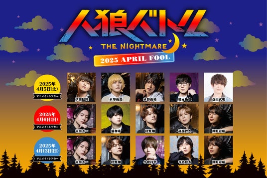 1回の決断が運命を左右するスリルに満ちたゲーム展開や数々の好プレイ・珍プレイで楽しさをお届けしてきた声優『人狼バトル』企画。2025年春もアニメイトシアターで男性声優の皆様をお招きし、ステージと座席が近く一体感を味わえる会場・アニメイトシアターにてイベントを開催致します。