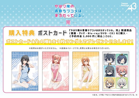 期間中に会場内にて『やはり俺の青春ラブコメはまちがっている。完』関連商品(書籍・グッズ・Blu-ray/DVD・CD)をご購入・ご予約内金2,000円(税込)ごとに、特典ポストカード(全4種)を1枚ランダムでプレゼントいたします!