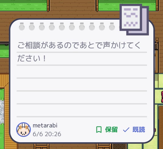 今回のアップデートで、MetaLifeに置き手紙機能が搭載され、相手がスペースに戻ったタイミングでメッセージを確認してもらうことができるようになりました。