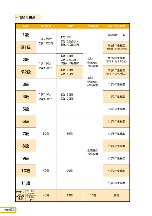 ▲実用数学技能検定「数検」には15の階級があり、1~5級を「数学検定」、6~11級とかず・かたち検定を「算数検定」と呼びます。