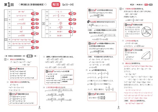 数学検定の準2級は、主に計算力を測る計算技能検定(1次)と、応用力を測る数理技能検定(2次)に分かれています。同じ単元でも1次と2次で問題傾向が異なるため、それぞれのちがいをきちんと理解したうえで本番に臨むことが望ましいです。本書は二部構成になっており、前半で1次の対策、後半で2次の対策、とそれぞれのちがいを意識しながらしっかり対策することができます。