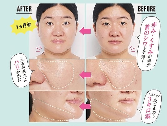 その効果があってか、1ヵ月の間に海外ロケが3度あったにもかかわらず、赤み・くすみ・毛穴感がしっかり減少。さらには「こすらないマッサージ」の効果で、あごまわりのたるみまで解消されました!