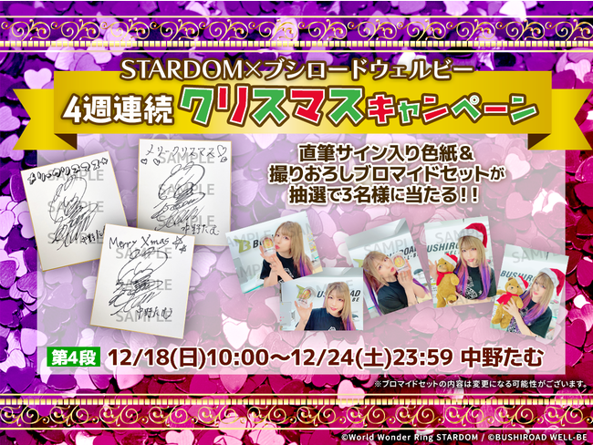 株式会社ブシロード(本社:東京都中野区、代表取締役社長:木谷高明)のグループ会社である株式会社ブシロードウェルビー(本社:東京都中野区、代表取締役社長:大場隆志)より、同グループ会社である株式会社ブシロードファイト(本社:東京都中野区、代表取締役社長:原田克彦)が運営する女子プロレス『スターダム』とのコラボ企画として、所属選手たちの直筆サイン入り色紙&撮りおろしブロマイドセットが抽選で当たる4週連続Xmasキャンペーンを実施することをお知らせいたします。
