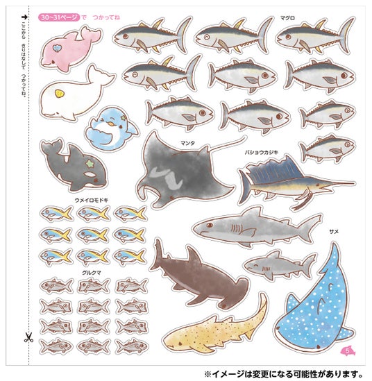 アオイルカ、ピンクイルカ、シャチ、シロイルカから、クラゲやカエルアンコウ、クリオネ、さらにサンゴやサメ、サバやマグロ、貝まで。いろいろな種類の海の生き物たちのシールがたっぷり300枚以上!