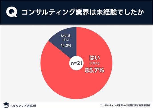 「コンサルティング業界は未経験でしたか」という質問に対し、85.7%が「はい」と回答。「未経験でも大丈夫か」という心配は、未経験からの転職を考える多くの人が抱えていると予測されるが、未経験からの転職も十分に可能であるといえる結果となった。