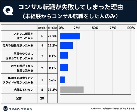 未経験からコンサルティング業界に転職した人に限定して「コンサル転職が失敗してしまった理由」という質問で、27.8%が「ストレス耐性がなかったから」だと回答。次いで「努力を怠ったから」と答えた人が22.2%おり、努力する過程でストレスを感じた人が多いことが推測できた。