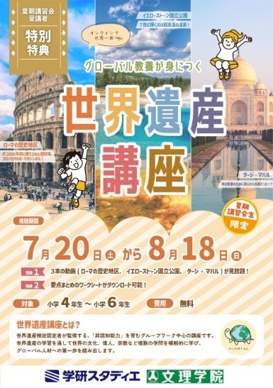 株式会社 学研ホールディングス(東京・品川/代表取締役社長:宮原博昭)のグループ会社、株式会社文理学院(山梨・都留/代表取締役社長:小倉勤)は、7月6日(土)の「世界遺産講座クイズフェス」と、7月20日(土)~8月18日(日)の「世界遺産講座」に夏期講習参加の小学4~6年生を無料で招待します。