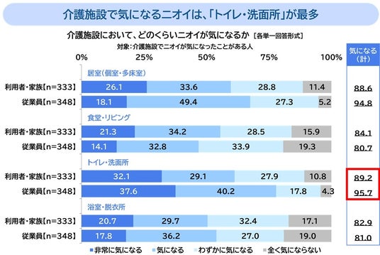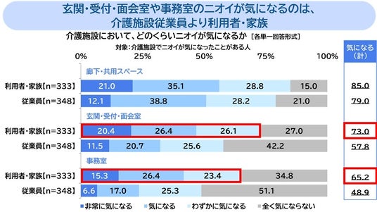 従業員よりも利用者・家族のほうが共用スペースのニオイに敏感であることが明らかになりました。見落とされがちな場所においても、ニオイ対策の強化が求められます。