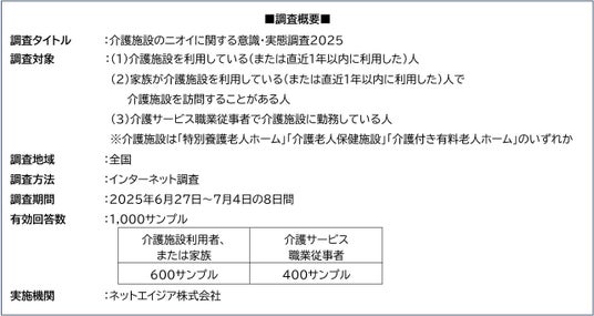 パナソニック株式会社 空質空調社(空間のニオイに対して高い脱臭効果(※)を発揮する「ジアイーノ」を展開、以下、パナソニック 空質空調社)は、2025年6月27日~7月4日の8日間、「介護施設のニオイに関する意識・実態調査2025」を実施し、1,000名の有効サンプルを集計しました。(調査協力機関:ネットエイジア株式会社)
