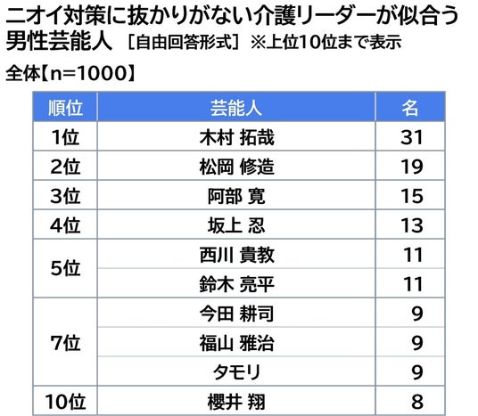 全回答者(1,000名)に、ニオイ対策に抜かりがない介護リーダーが似合う男性芸能人を聞いたところ、1位「木村 拓哉さん」(31名)、2位「松岡 修造さん」(19名)、3位「阿部 寛さん」(15名)となりました。
