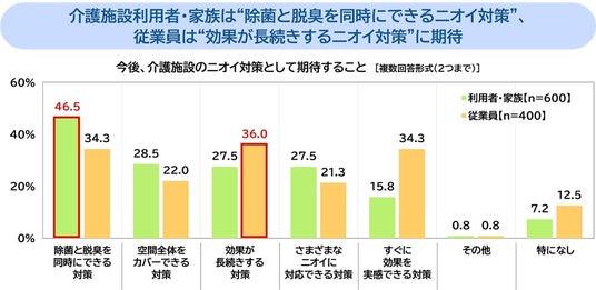 利用者・家族(600名)の回答をみると、「除菌と脱臭を同時にできる対策」(46.5%)が最も高くなり、「空間全体をカバーできる対策」(28.5%)、「効果が長続きする対策」「さまざまなニオイに対応できる対策」(いずれも27.5%)が続きました。介護施設の利用者や家族には、介護施設にニオイ対策だけでなく衛生対策も施してほしいと考える人が多いようです。