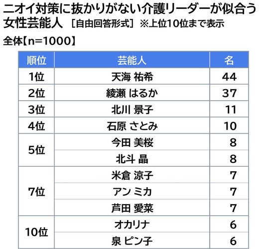 ◆ニオイ対策に抜かりがない介護リーダーが似合う女性芸能人 1位「天海 祐希さん」2位「綾瀬 はるかさん」