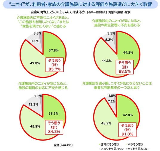 また、【介護施設を選ぶ際、ニオイが気にならないことは重要な判断基準の一つだと思う】では『そう思う(計)』は91.0%となり、ニオイ対策の徹底が、利用者・家族の介護施設に対する評価や信頼感、さらには施設選びにも大きく影響することが明らかになりました。