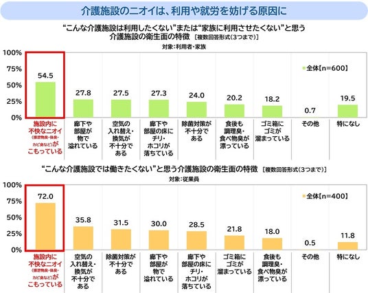 利用者・家族(600名)に、“こんな介護施設は利用したくない”または“家族に利用させたくない”と思う介護施設の衛生面の特徴を聞いたところ、「施設内に不快なニオイ(排泄物臭・体臭・カビ臭など)がこもっている」(54.5%)が最も高くなりました。また、従業員(400名)に、“こんな介護施設では働きたくない”と思う介護施設の衛生面の特徴を聞いたところ、「施設内に不快なニオイ(排泄物臭・体臭・カビ臭など)がこもっている」(72.0%)がダントツとなりました。