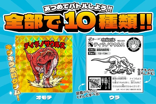 ズッカーン夏フェア中にMOVEをお買い上げいただくと、1冊につき1枚、MOVEオリジナルのキラキラ“ズッカーン バトルシール”がついてます※。今回モチーフとなった生物は、ティラノサウルス・スピノサウルス・ミツクリザメ・ヘビクイワシ・グリーンバシリスク・ホフマンナマケモノ・モザンビークドクハキコブラ・ギラファノコギリクワガタ・ハエトリグサの10種。ユーモアあふれる描き下ろしデザインでキラキラのカラフルホログラムに仕上げました♪