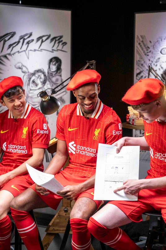 選手たちが制作した4コマ漫画は、リバプールFCの大ファンでもある『蒼く染めろ』漫画家の桜井ミヤトさんにバトンタッチされました。桜井さんは担当の編集者とともにプロセスを説明しながら、選手たちのコンセプトを融合した新たな4コマ漫画を完成させました。動画では、桜井さんがリバプールFCへの熱いエールを込め、細部にわたって丁寧に作り上げる制作の過程が捉えられています。この貴重な動画では、下書きからペン入れまでのプロセスを通じて、プロの漫画家がどのように作品を創り上げるかを間近で見ることができます。