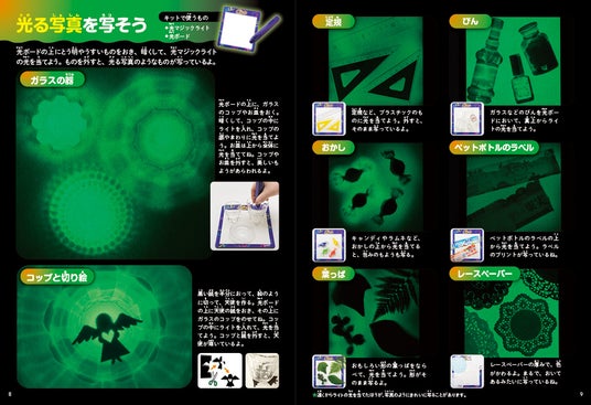 光る絵がかける! 光る写真が写せる! ひみつの手紙が作れる! 身近なものが光る! 幻想的な光の実験がたくさんできるキットです。