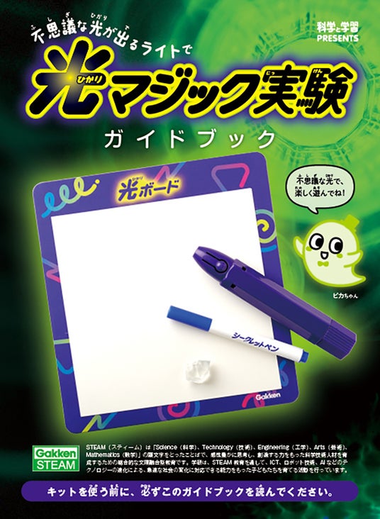 ●光マジックライト(光生物学的安全性の評価試験で人体(網膜)への安全性を確認済み)/●光ボード(15cm×15cmの蓄光シート付き)/●ミラクルペン(光であらわれる不思議なインクのペン)/●星のかけら(蓄光樹脂)/●ガイドブック(20ページ)が入っています。