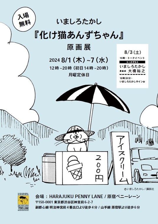 2024年、「時代を越えて世界と繋がる場所」としてリニューアル・オープンしたギャラリーカフェ「HARAJUKU PENNY LANE」では、5月の第 77回カンヌ国際映画祭、6月のアヌシー国際アニメーション映画祭 2024に出品され、国内外で話題のアニメーション映画『化け猫あんずちゃん』の国内劇場公開を記念し、8月1日(木)から 7日(水)まで、原作者であり、現在は講談社のコミックアプリ「コミックDAYS」で『化け猫あんずちゃん 風雲編』を連載中の、漫画家・いましろたかし氏の原画展を開催いたします。会場では「あんずちゃん」限定グッズの販売を行い、さらに8月3日(土)には、いましろ氏のトークイベント&サイン会も開催いたします。