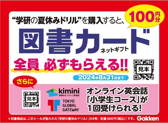 株式会社 学研ホールディングス(東京・品川/代表取締役社長:宮原博昭)のグループ会社、株式会社 Gakken(東京・品川/代表取締役社長:五郎丸徹)は、小学生向け学習ドリル「夏休みドリル」シリーズをお買い上げいただいた方全員に、図書カードネットギフト100円分がもらえるキャンペーンを2024年6月3日(月)よりスタートいたしました。
