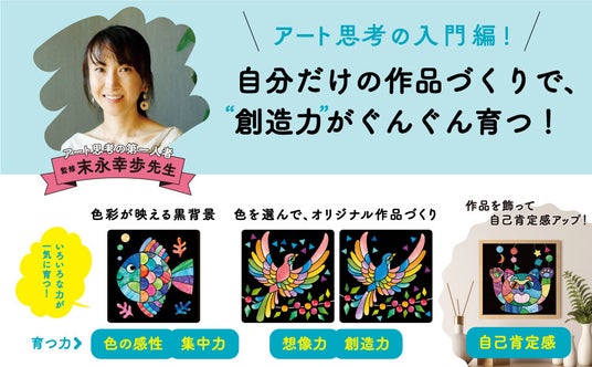 アート思考の第一人者・末永幸歩氏監修。真っ黒な背景にカラフルなシールを貼って、美しいイラストを完成させるシールパズルです。「創造力」「集中力」「色彩感覚」「自己肯定感」など将来につながる力を育みます。