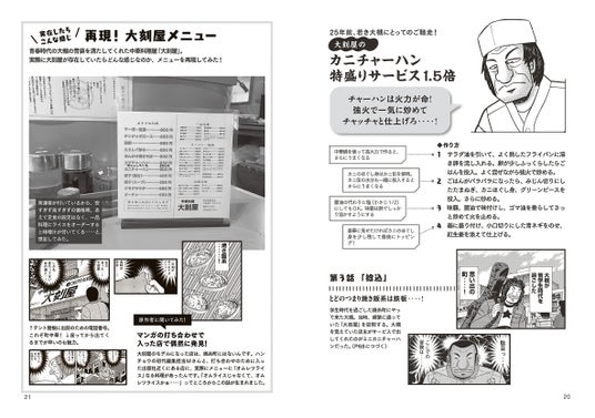 大槻が風邪ウイルスを撃退するために自炊したつみれ鍋。学生時代に行きつけだった町中華「大刻屋」で食べたカニチャーハン、そしてオムレツライス。さらには鉄人黒服・柳内の鶏そぼろ茶漬けから、大根の葉っぱのふりかけまで、白飯が愛しくなるメニューを中心に35品。フライパンを、鍋をふるい、今すぐ作り始めろ!