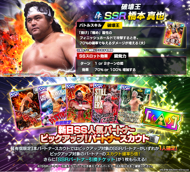 株式会社ブシロード(本社:東京都中野区、代表取締役社長:木谷高明)は、株式会社ドリコム(本社:東京都品川区、代表取締役社長:内藤 裕紀)と共同開発しているスマートフォンゲームアプリ『新日本プロレスSTRONG SPIRITS』(以下、新日SS)にて、レジェンド限定パートナー「[破壊王]橋本 真也」選手が復刻して登場するパートナースカウトと、人気パートナーをピックアップした有償限定パートナースカウトを開始いたしました。