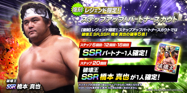 また、本スカウトで初登場するSSR、SR「[破壊王]橋本真也」は、ピックアップ対象としてステップ回数に関わらずスカウト確率が通常の5倍で、ステップ20回目で必ず1人獲得できます。