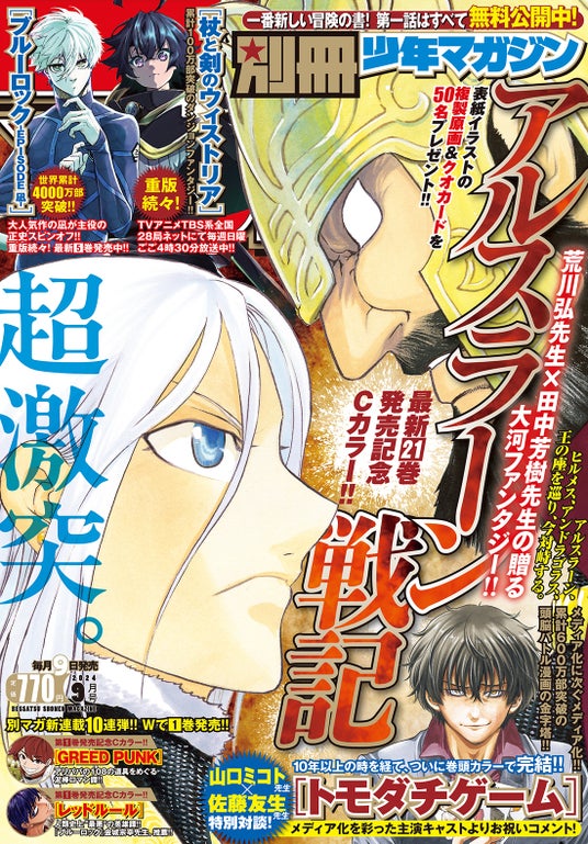 2024年8月8日(木)発売の「別冊少年マガジン」9月号は、最新21巻の発売を記念して『アルスラーン戦記』が表紙&Cカラーで登場!