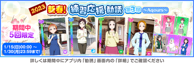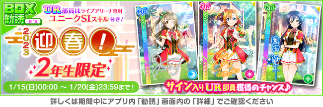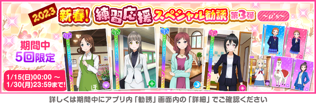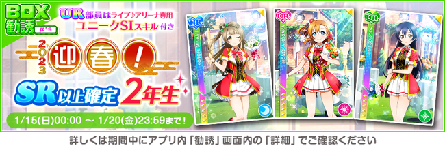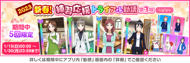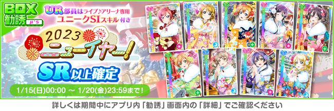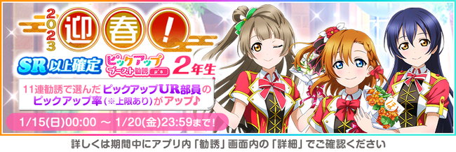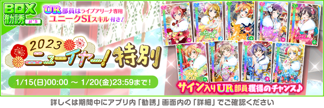株式会社ブシロード(本社:東京都中野区、代表取締役社長:木谷高明)は、KLab株式会社(本社:東京都港区、代表取締役社長:森田英克)と共同開発いたしましたスマートフォン向けアプリ『ラブライブ!スクールアイドルフェスティバル』(以下、スクフェス) において2023スクフェスニューイヤーキャンペーン第4弾の開催をお知らせいたします。