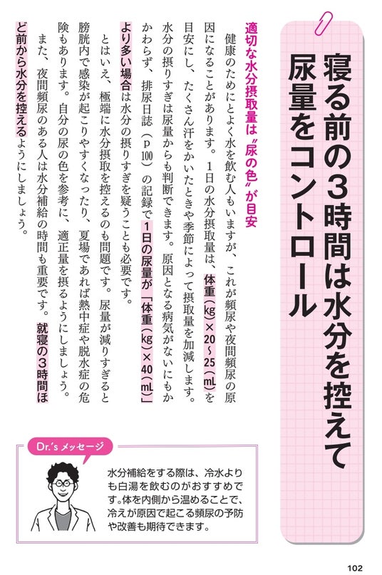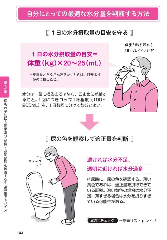 ……など、すぐに試せる知識やトレーニングをたっぷり掲載。さらに、「市販薬と尿ケアアイテムリスト」、自分で尿の色を確認できる「尿チェックシート付き」。自分の尿の状態をチェックして、自分にあったセルフケアに取り組みましょう。