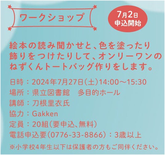 大型絵本で刀根先生による『ねずくんとパパのおるすばん』の読み聞かせと、色を塗ったり飾りをつけて、オンリーワンのねずくんトートバッグ作りをします。参加費は無料です。先着順の定員20組で、予約制です。ぜひお早めに電話でお申し込みください。満員の場合もありますのでご了承ください。【ワークショップ概要】