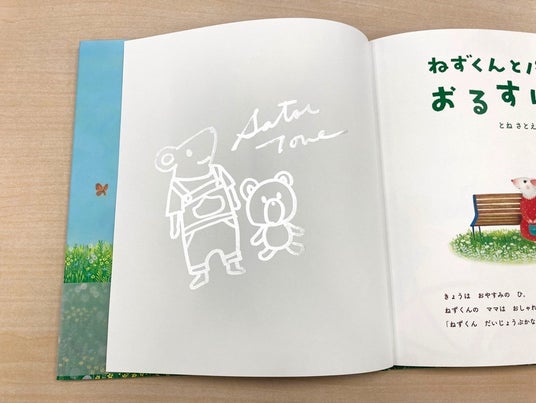 ▲サインのサンプル。『ねずくんとパパのおるすばん』のサインです。かわいいねずくんのイラストがサインに添えられています。写真では見えづらいですが、銀のペンで書かれています。サインしてもらう絵本によって、描かれるイラストが違うかも!?