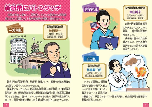 ▲新紙幣の肖像となった人物3名について、イラストで分かりやすく解説します。