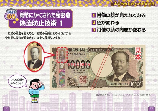 ▲日本のお金の流通のしくみや紙幣製造技術のクイズ「日本のお金にかくされた秘密」章。