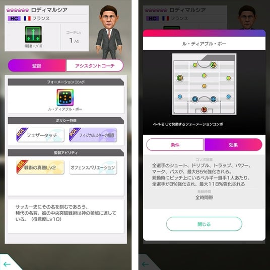 該当の選手を編成すると強くなるフォーメーションコンボ「ル・ディアブル・ボー」と、「戦術得意度Lv10」を持つ新★6監督「ロディマルシア」が登場! 期間中に開催される特別ミッション「10試合行う」で獲得できます。