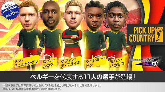 今回の“ピックアップカントリーSCOUT”では、「ケヴィン・デ・ブライネ」「ロメル・ルカク」「ジェレミー・ドク」「ヤン・フェルトンゲン」「ヨハン・バカヨコ」「ロイス・オペンダ」「アマドゥ・オナナ」「クーン・カステールス」「アルトゥール・テアテ」「ティモシー・カスターニュ」「ヴァウト・ファース」といった、ベルギーの中央突破を得意戦術とする新★5選手11人が、「レベルMAX(Lv.50)/覚醒2段階達成/各スキル・各能力UP Lv.3達成」で登場します。