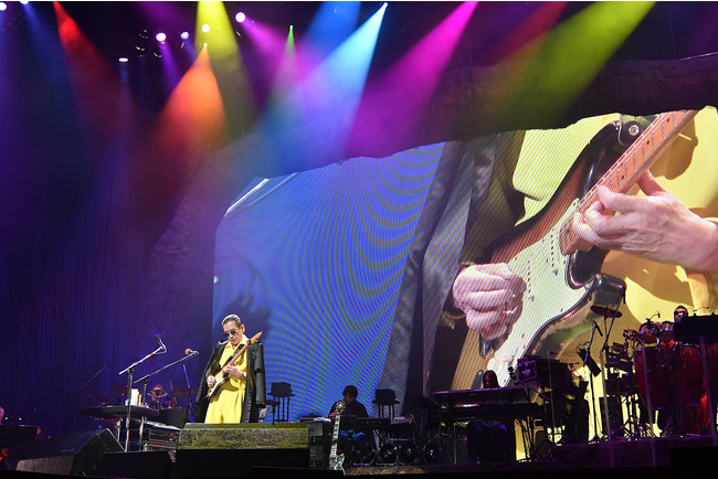 黄色のつなぎ姿でステージに登場した高中正義。そして、バックを固める屈強のメンバーたちも虹色を一色ごとに着こなすコーディネートで「虹」を表現。高度なアンサンブルと一聴して耳から離れない印象的なフレーズを兼ね備えた名曲の数々を、丁寧に演奏していく。