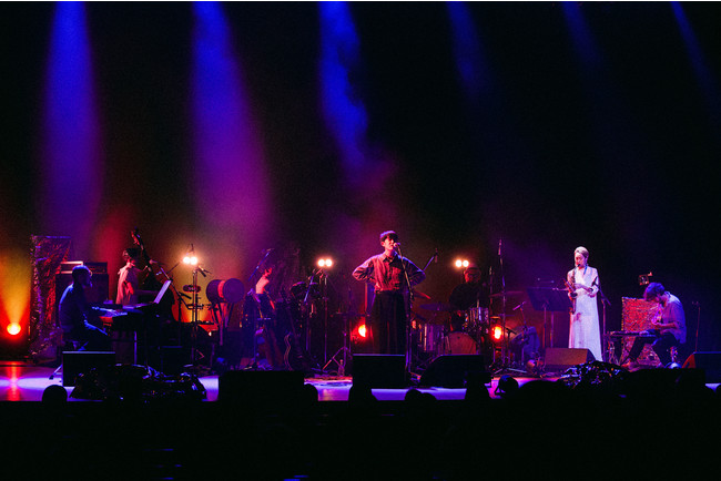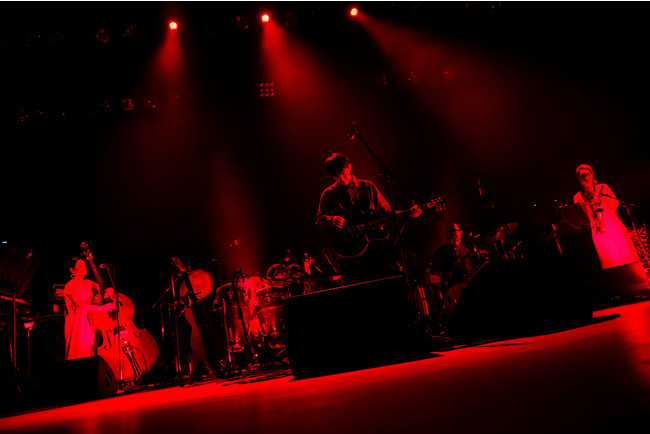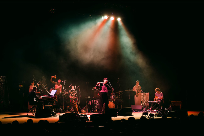 海の底、あるいは奥深い森を思わせる暗く闇に沈んだステージ。楽器の発する音なのか生き物の鳴き声なのか判別がつかない、謎めいた音が響いている。幕開けの「kohei」から、「爆発」「心」「悪魔」の4曲は、アルバム『心理』収録曲を続けて披露。穏やかな波のようなピアノフレーズで始まったのは上述の「朝顔」。客席の壁面には影絵の花のようなライトが投影される。繊細な心情を描きつつも絶望に陥らず、差し込む光を感じさせる名曲。折坂は柔らかな笑みを浮かべながら歌い奏でていた。続く「針の穴」では観客にハンドクラップを誘う場面も。かといって、通常のライブでよくある“一体感を求める”という距離感のアクションでもない。暗闇でギターを鳴らしながらの独唱でスタートした次曲「トーチ」以降、ほぼ最後まで、ステージ上は日常世界から切り離された、観る者を深く引き込んでやまない神秘の空間となっていた。