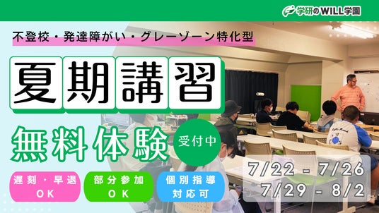 株式会社 学研ホールディングス(東京・品川/代表取締役社長:宮原博昭)のグループ会社、株式会社学研エル・スタッフィング(東京・高田馬場/代表取締役社長:伊藤弘雅)は、不登校・発達障がいのある児童生徒を専門的に受け入れている「学研WILL学園」や「学研の家庭教師 訪問支援室」の支援ノウハウを活かしてキャンパス(対面)またはオンラインどちらでも受講可能な「2024年度夏期特別講習会」を開催予定です。発達障がいのある生徒や起立性調節障害で朝早くからの受講が難しい生徒にぜひおすすめしたい内容となっておりますので、奮ってご参加ください。