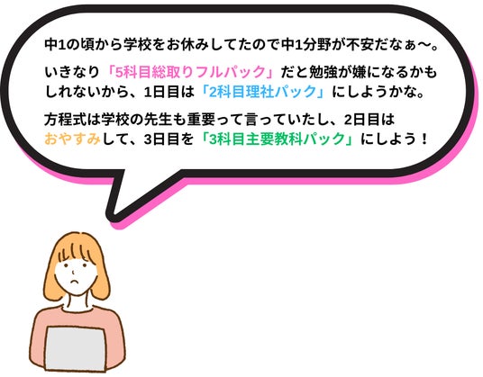 「1日目は基礎の基礎なので2科のみ、2日目は5科、3日目からは家族旅行なので受講しない」なんて受講スタイルも自由自在に組めちゃいます!