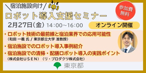 東京都では、宿泊施設におけるロボット導入事例や、ベンダー企業によるロボット導入成功のポイントをご紹介する「ロボット導入支援セミナー」を開催します。ロボット導入における技術面・費用面の不安を解消し、宿泊施設における省力化の取組を後押しします。ぜひご参加ください。