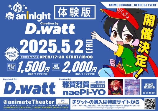 今回の『アニナイト』は、「aninight 体験版 Curation by D.watt」と題し、なんとSPECIAL PRICEの前売り1,500円(税込/1ドリンク込)/当日2,000円(税込/1ドリンク込)で開催決定!